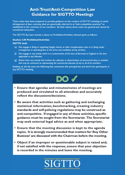 These notes have been prepared to provide guidance on the conduct of SIGTTO meetings to avoid infringement of laws covering what are generically referred to as “anti-competitive practices” as established in the countries of our members. By their nature, these notes are general and cannot be considered exhaustive.