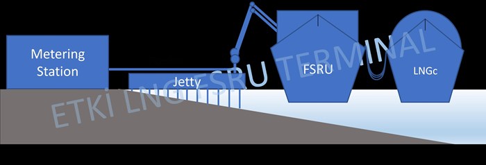 The Etki LNG Terminal is an unconventional also called hybrid LNG receiving and regasification facility which consists of a steel piled and concrete capped jetty which encompasses berthing and mooring facilities for a 170.000 cbm Floating Storage and Regasification Unit (FSRU) utilized for the import, storage and regasification of Liquefied Natural Gas. FSRU is equipped with GTT Mark III tanks made of a reinforced membrane surrounded by ballasts tanks with double bottom and double side structure. Its total storage volume is 170.000 cbm, distributed among four cargo tanks. LNG stored in tanks at atmospheric pressure and at about temperature of (minus) -162 °C, are heated, vaporized, pressurized and sent to grid in accordance with the onshore demand. A double-shell reinforced insulation system protects the load from exposure to heat exchange with the environment and reduces the rate of evaporation of the liquid. The regasification plant located on the FSRU has an aggregate capacity of 1.000 mmscf/d with four regasification units. In addition, it has systems for handling the "Boil Off Gas" (BOG) generated in the process as well as using it as fuel for the auxiliary systems as may be required.